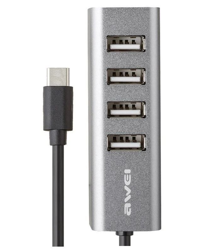 Το USB hub της εταιρείας Awei διαθέτει 4 θύρες εξόδου USB 2.0, κατάλληλες για να συνδέσετε ταυτόχρονα στον υπολογιστή, συσκευές όπως ποντίκια, στικάκια, εξωτερικούς σκληρούς δίσκους, πληκτρολόγια και πολλά άλλα. Τροφοδοτείται μέσω του καλωδίου με βύσμα Type-C που συνδέεται στον υπολογιστή σας ή το smartphone σας.
