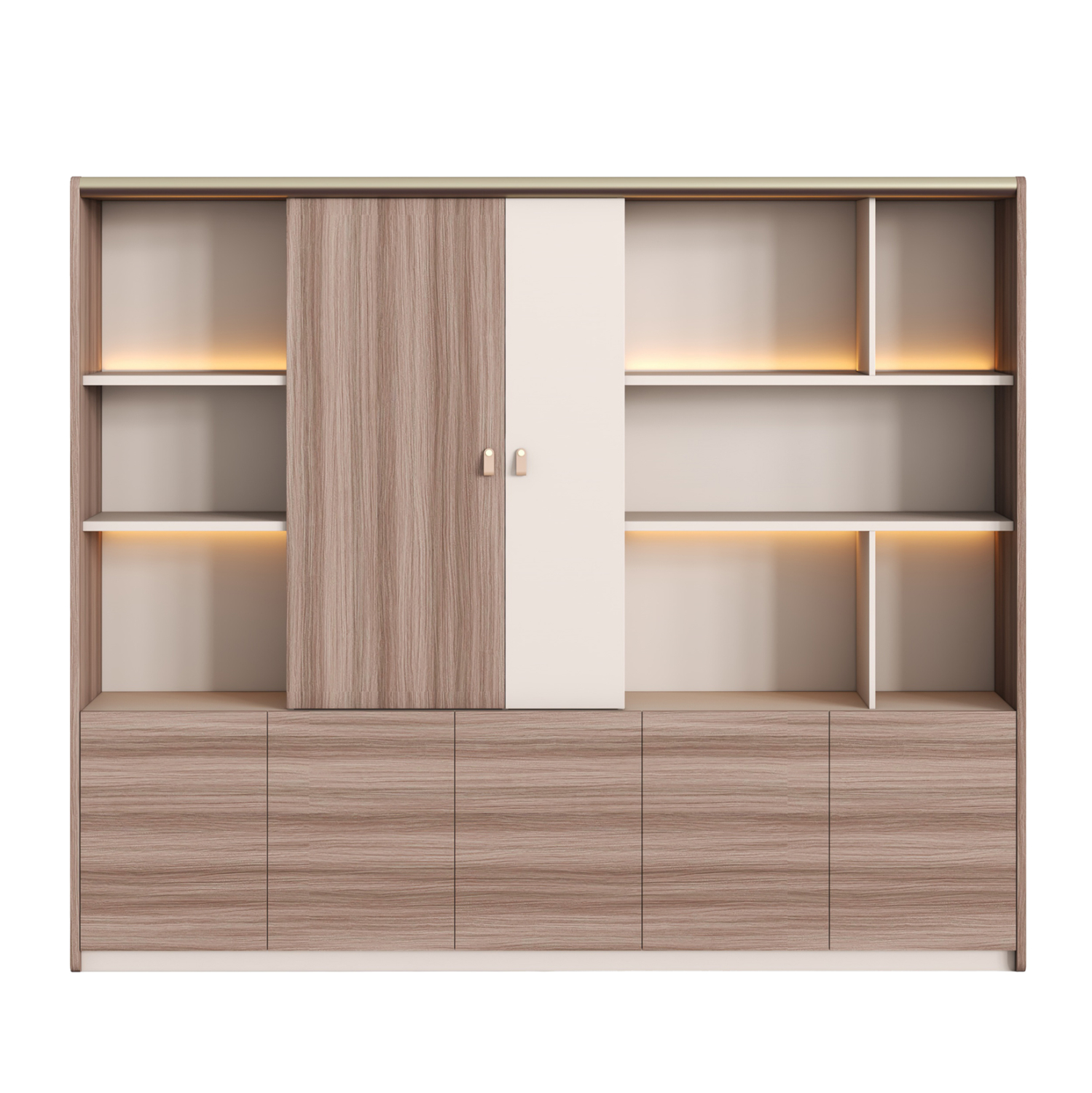 Η βιβλιοθήκη γραφείου SUPERON αποτελεί μια ολοκληρωμένη και κομψή λύση αποθήκευσης για σύγχρονους επαγγελματικούς χώρους. Ο σχεδιασμός της βασίζεται σε διχρωμία φυσικού ξύλου και μπεζ μελαμίνης, προσφέροντας ισορροπία ανάμεσα στη ζεστασιά και τη μοντέρνα αισθητική.