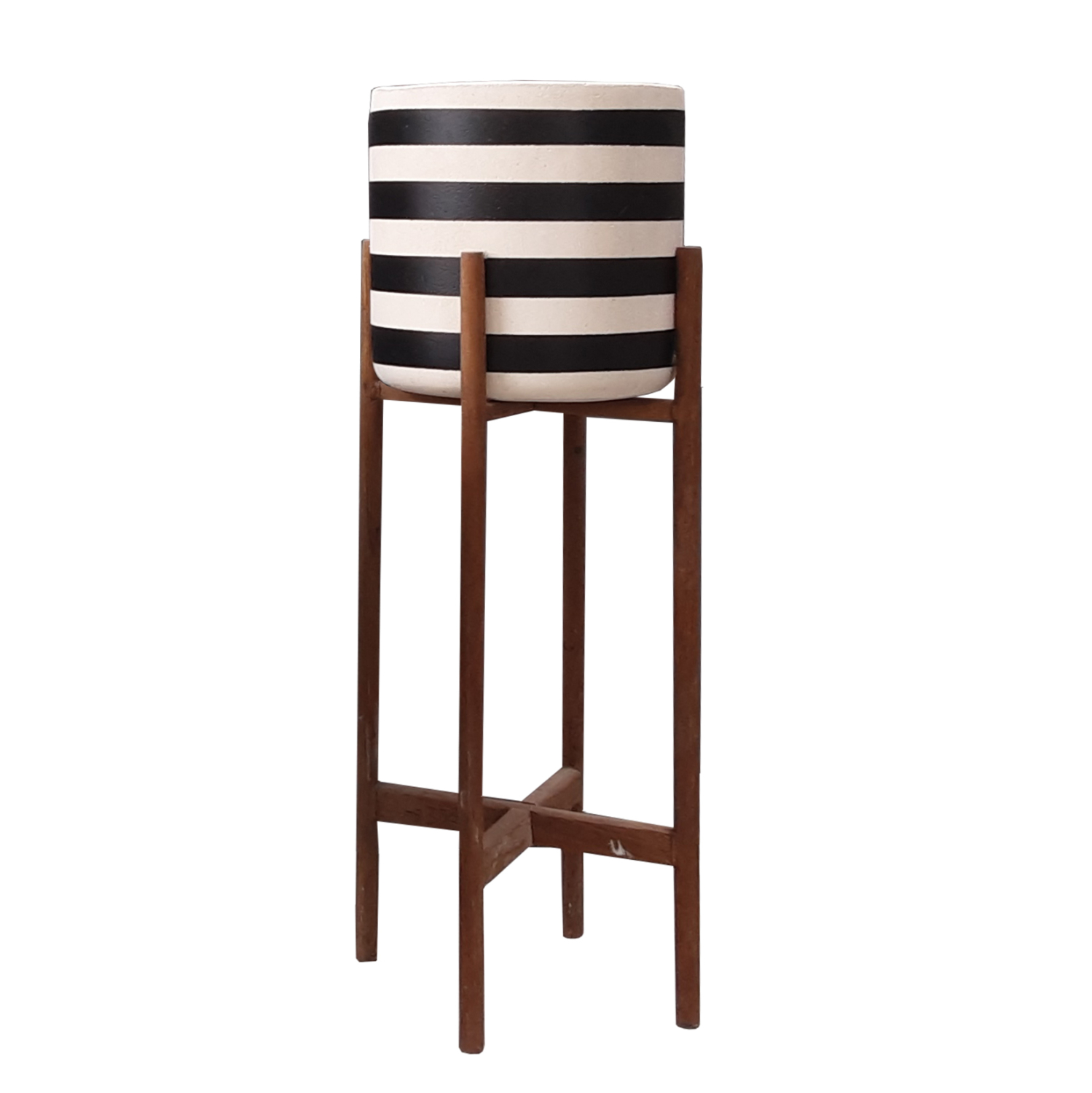 Η γλάστρα εσωτερικού χώρου (κασπό) RENTIL είναι κατασκευασμένη από Fiber Cement σε ΛΕΥΚΟ και ΜΑΥΡΟ χρώμα σε ρίγες. Το ιδιαίτερο χαρακτηριστικό της είναι ότι συνοδεύεται και τοποθετείται σε μια χιαστί βάση από ξύλο teak. Συνιστάται η τοποθέτηση εσωτερικού δοχείου εάν πρόκειται να την χρησιμοποιήσετε με νερό!