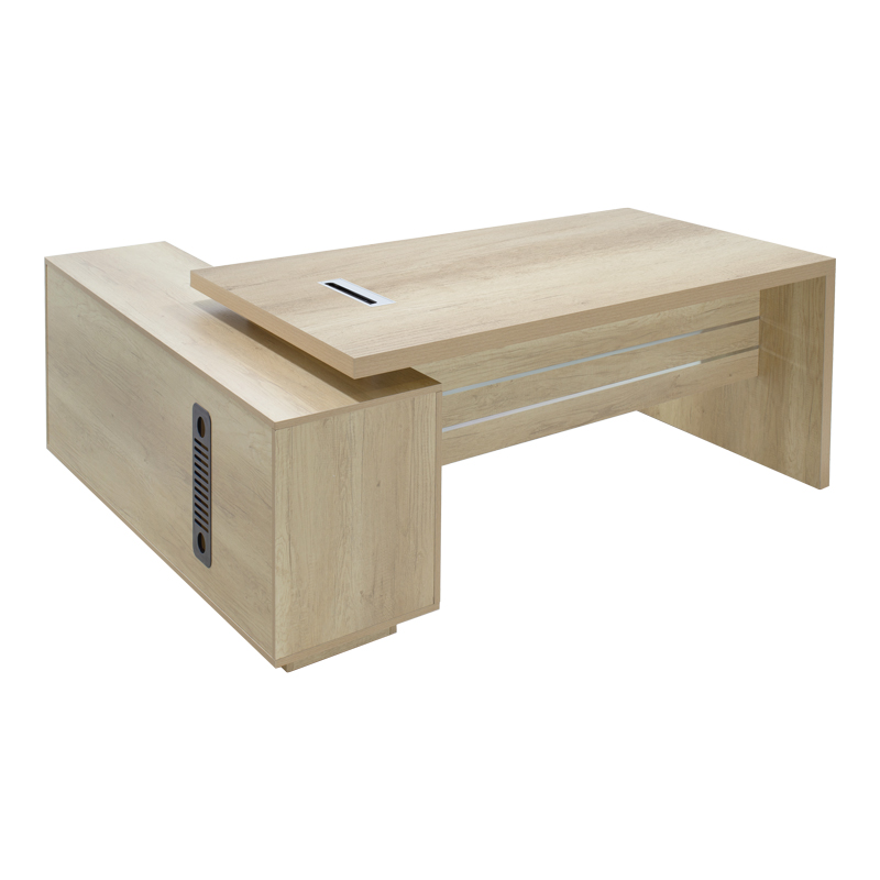 - Κύριο γραφείο: Επιφάνεια κατασκευασμένη από μοριοσανίδα με επένδυση μελαμίνης υψηλής ποιότητα, πάχους 25 χιλ. Τα πλαϊνά μέρη φέρουν μοριοσανίδα με επένδυση μελαμίνης, όλα σε φυσικό χρώμα.