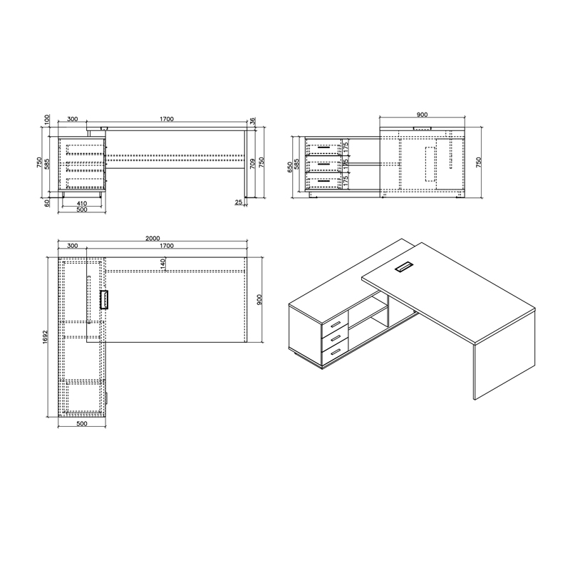 - Βοηθητικό γραφείο: Φέρει ενσωματωμένο ερμάριο με συρτάρια και ράφια με πολλαπλούς αποθηκευτικούς χώρους. Πάχος επιφάνειας 25χιλ και πλαϊνών μερών 20 χιλ.