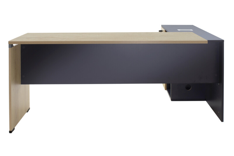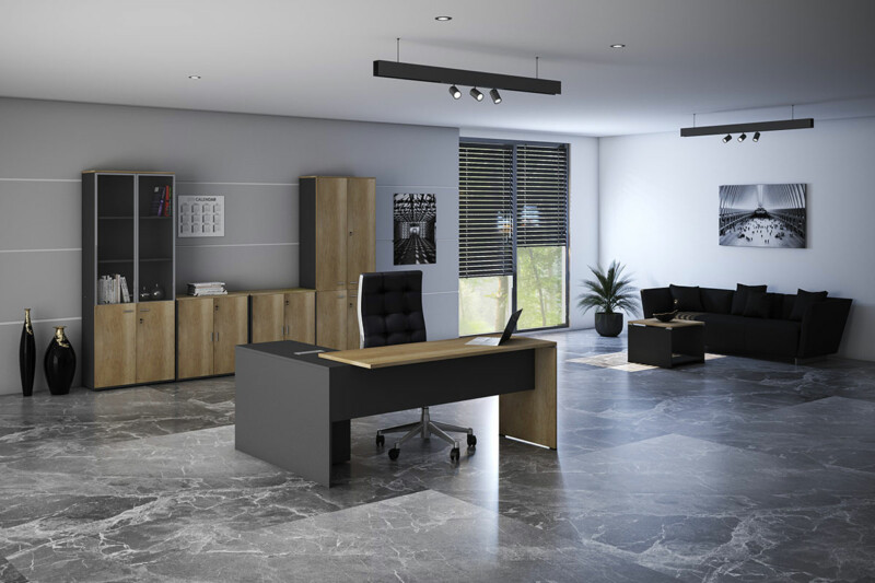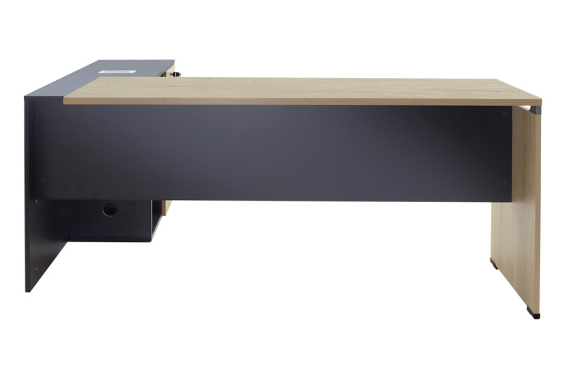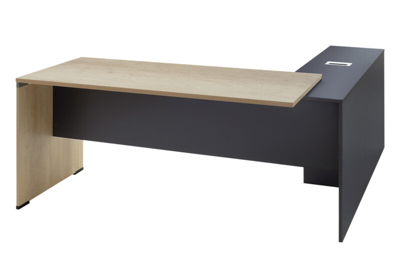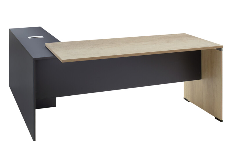 Γραφείο διεύθυνσης με ενσωματωμένο γωνιακό αναστρέψιμο ερμάριο στον εντυπωσιακό χρωματισμό: φυσικό – ανθρακί. Κατασκευασμένο από υλικά υψηλών προδιαγραφών και σύμφωνα με τις εργονομικές απαιτήσεις του σήμερα.
