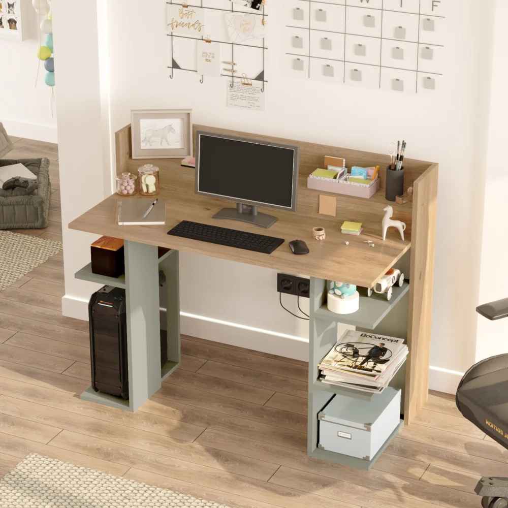 - Μεγάλη και άνετη επιφάνεια εργασίας με ράφι πίσω που δένει αρμονικά με την υπόλοιπη επιφάνεια