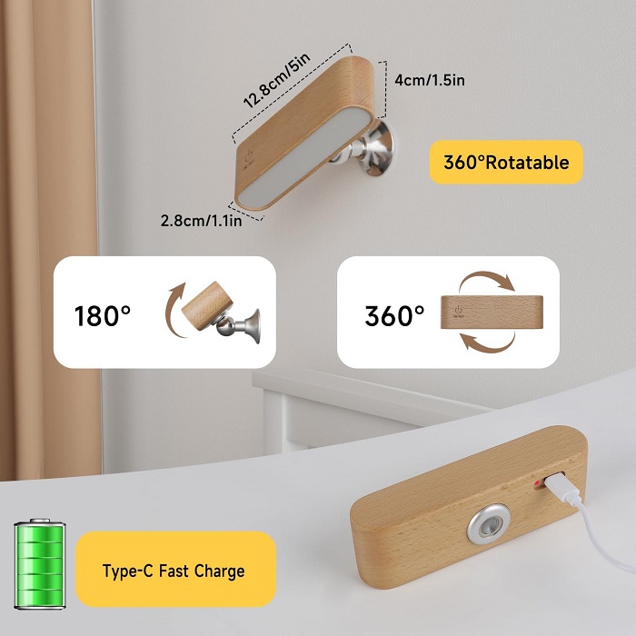 Επιτοίχιο διακοσμητικό φωτιστικό LED σε μοντέρνο σχεδιασμό με ξύλινο εφέ, επαναφορτιζόμενο, με μέγιστη αυτονομία μπαταρίας έως 10 ώρες.