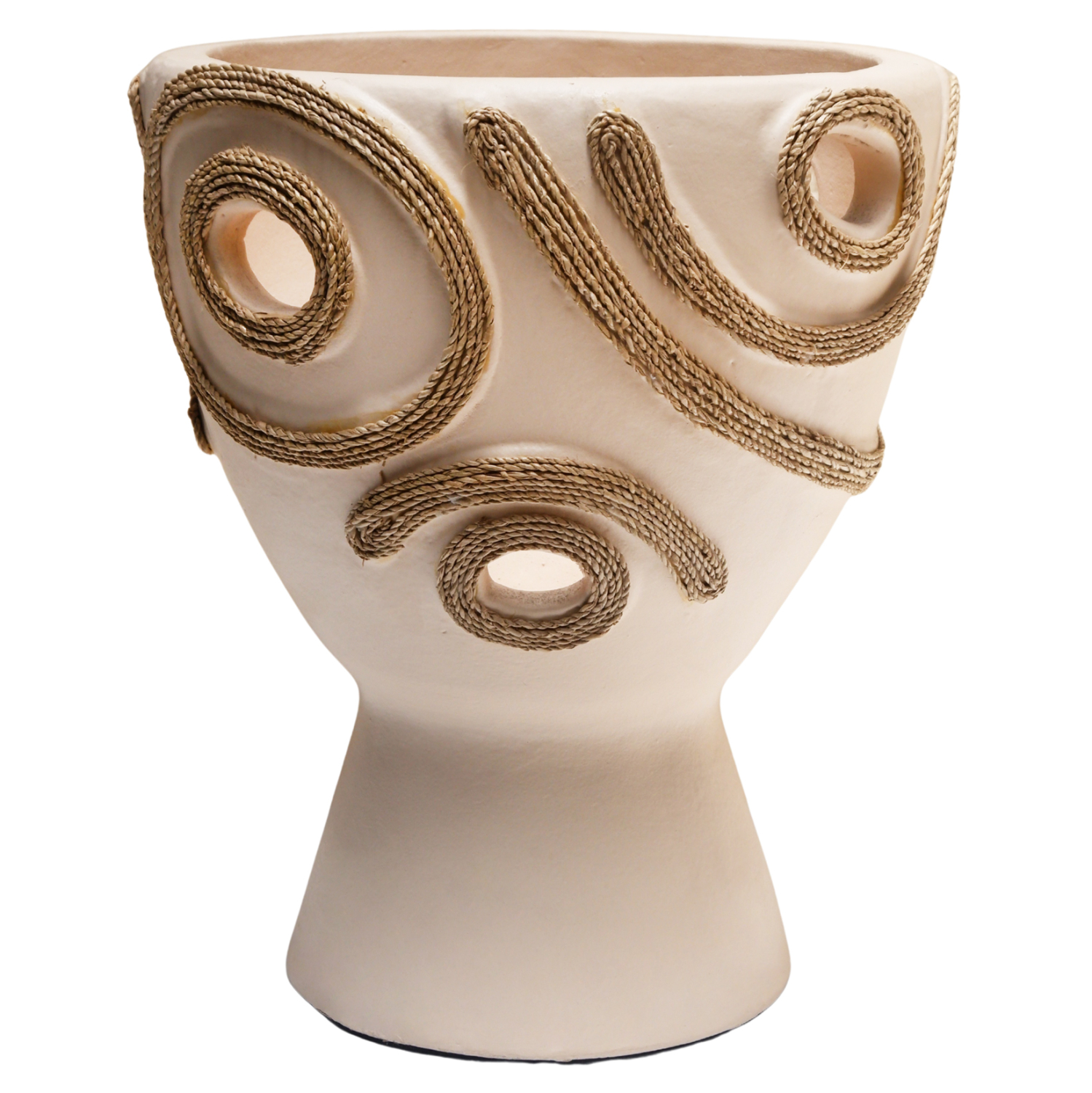 Το επιτραπέζιο χειροποίητο διακοσμητικό βάζο DEAN έχει το σχήμα μεγάλου κυπέλλου. Είναι κατασκευασμένο εξολοκλήρου από τερακότα σε ΚΡΕΜ χρώμα ενώ διαθέτει διακοσμητικά σχέδια με σχοινί από ίνες φοίνικα στις πλευρές του βάζου. Ιδανικό για πληθώρα χώρων, τόσο για το σπίτι, όσο και για επαγγελματικούς χώρους.