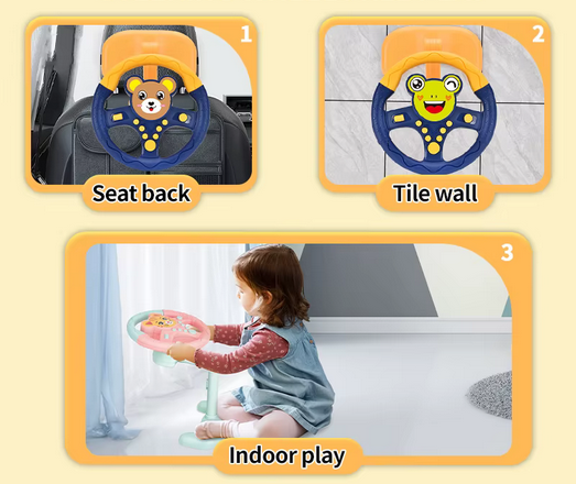 Παιδική ηλεκτρονική τιμονιέρα σε εντυπωσιακό πολύχρωμο σχεδιασμό, με ήχους, μουσική και φωτισμό. Περιστρέφεται 360° για μία ρεαλιστική εμπειρία οδήγησης. Διαθέτει πτυσσόμενο βραχίονα για ρύθμιση θέσης. Τοποθετείται με βεντούζες σε οποιαδήποτε λεία επιφάνεια ή με τον ειδικό ιμάντα στο πίσω μέρος του καθίσματος του αυτοκινήτου.
