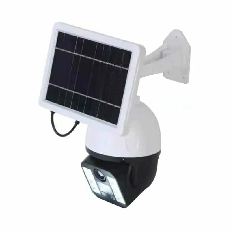 Ηλιακός προβολέας LED σε λευκό χρώμα και σχεδιασμό κάμερας ασφαλείας για να απωθεί τους εισβολείς.