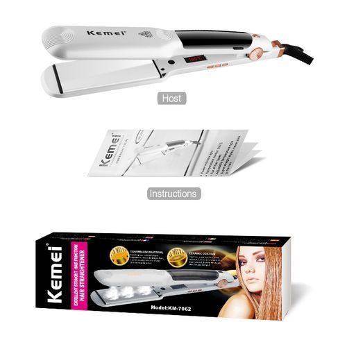 Ισιωτική μαλλιών Kemei με ατμό και κεραμικές πλάκες με τεχνολογία τουρμαλίνης που προστατεύει τα μαλλιά απ την θερμότητα και τη φθορά, για ένα λείο και λαμπερό αποτέλεσμα! Οι φαρδιές της πλάκες και η ταχύτατη θέρμανσή της σας βοηθούν να ολοκληρώσετε το χτένισμα σας σε ελάχιστο χρόνο.
