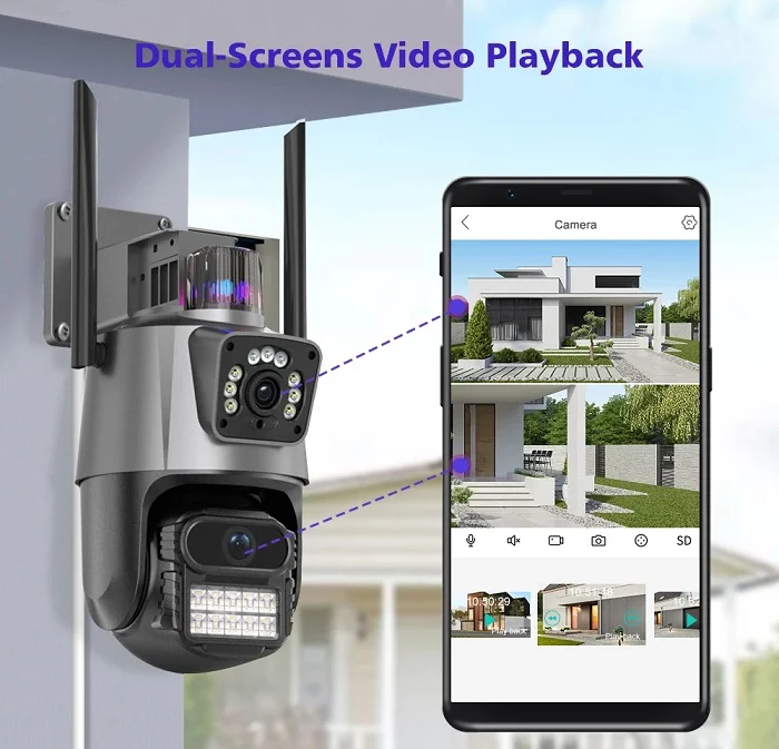 Κάμερα ασφαλείας IP διπλή, με εύκολη εγκατάσταση. Διαθέτει δυνατότητα σύνδεσης WIFI και άμεσου ελέγχου από το smartphone σας. Με ανιχνευτή κίνησης σε έως και 5m για εξοικονόμηση ενέργειας, που ενεργοποιείται και σας ειδοποιεί άμεσα μόλις ανιχνεύσει κίνηση στον χώρο. Προσφέρει υψηλή ευκρίνεια, με νυχτερινή λήψη υπερύθρων έως και 25m, με αισθητήρα φωτός που ενεργοποιεί τη νυχτερινή λήψη αυτόματα όταν σκοτεινιάσει. Με αμφίδρομη επικοινωνία μέσω του ενσωματωμένου μικροφώνου και ηχείου που διαθέτει.