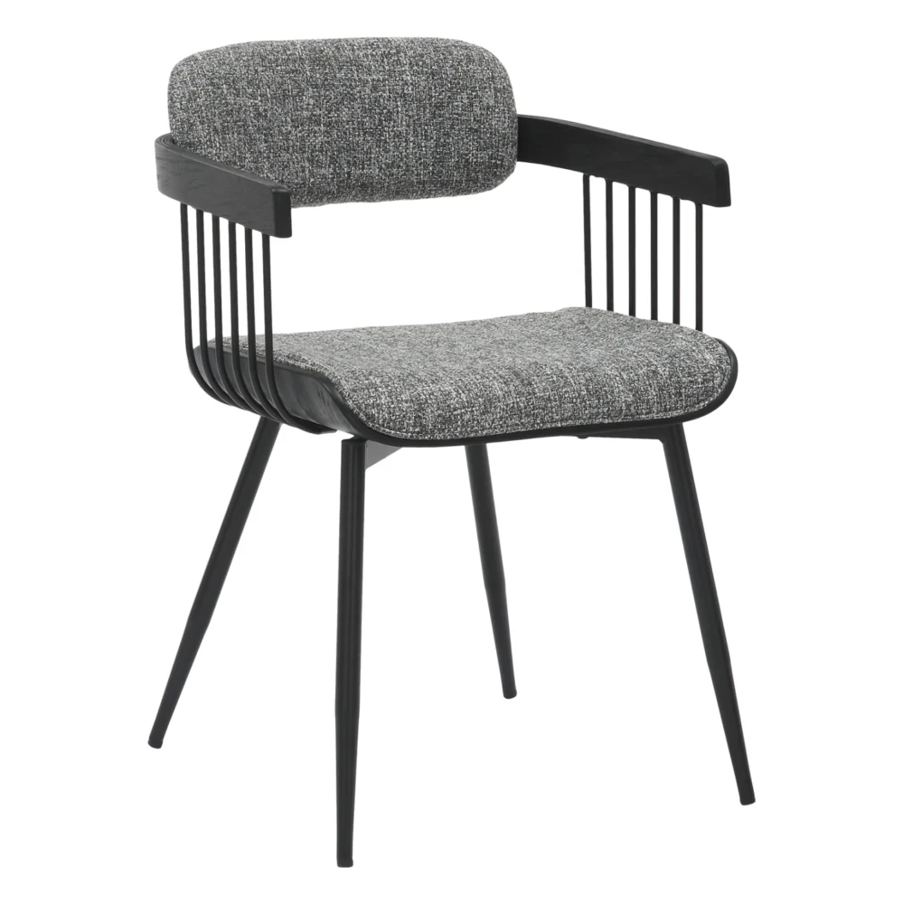Η καρέκλα τραπεζαρίας LANG διαθέτει μεταλλικό σκελετό σε ΜΑΥΡΟ χρώμα ενώ το κάθισμα και η μίνιμαλ πλάτη είναι επενδυμένα με ποιοτικό ύφασμα σε ΓΚΡΙ χρώμα. Η βάση τόσο της πλάτης όσο και του καθίσματος είναι κατασκευασμένα από ποιοτικό κόντρα-πλακέ θαλάσσης, όπως και η ράγα στο επάνω μέρος των μπράτσων που δίνει μια διαφορετική «πινελιά» στην όμορφη αυτή καρέκλα.