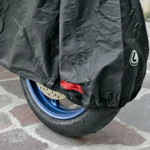 Προστατευτική κουκούλα μηχανής/μοτοσυκλέτας COVERLUX, ιταλικής προέλευσης, κατάλληλη για χρήση σε όλες τις καιρικές συνθήκες, καθώς με τη χρήση της αποτρέπονται οι επιβλαβείς αχτίδες του ηλίου, η βροχή, ο αέρας, το χιόνι, η σκόνη, οι κουτσουλιές από πτηνά, κ.ά. να εισχωρήσουν στα μηχανικά, μεταλλικά και πλαστικά μέρη του οχήματος και να τα φθείρουν. Πρόκειται για μια κουκούλα με εξαιρετικά μαλακή σε υφή εσωτερική επένδυση και εξωτερική πλαστικοποιημένη αδιάβροχη επίστρωση υψηλής ποιότητας και αντοχής. Οι ραφές της καλύπτονται από ειδική αδιάβροχη ταινία για αποφυγή εισχώρησης υγρού στοιχείου στο εσωτερικό μέρος της και διαθέτει λάστιχο στο μπροστινό και στον πίσω τροχό μαζί με ιμάντες συγκράτησης για να μπορεί να συγκρατείται ικανοποιητικά επάνω στο όχημα ακόμη και σε περίπτωση ισχυρών ανέμων. Επίσης, επάνω στη κουκούλα υπάρχει ειδική οπή για να μπορείτε να τοποθετήσετε αντικλεπτική κουλούρα ασφαλείας (δεν περιλαμβάνεται). Είναι ιδιαιτέρως ελαφριά σε βάρος για να μπορείτε να την τοποθετείτε/αφαιρείτε με ευκολία καθημερινά και στη συσκευασία περιλαμβάνεται ειδικό σακίδιο αποθήκευσης και μεταφοράς. Εύκολη και γρήγορη χρήση.