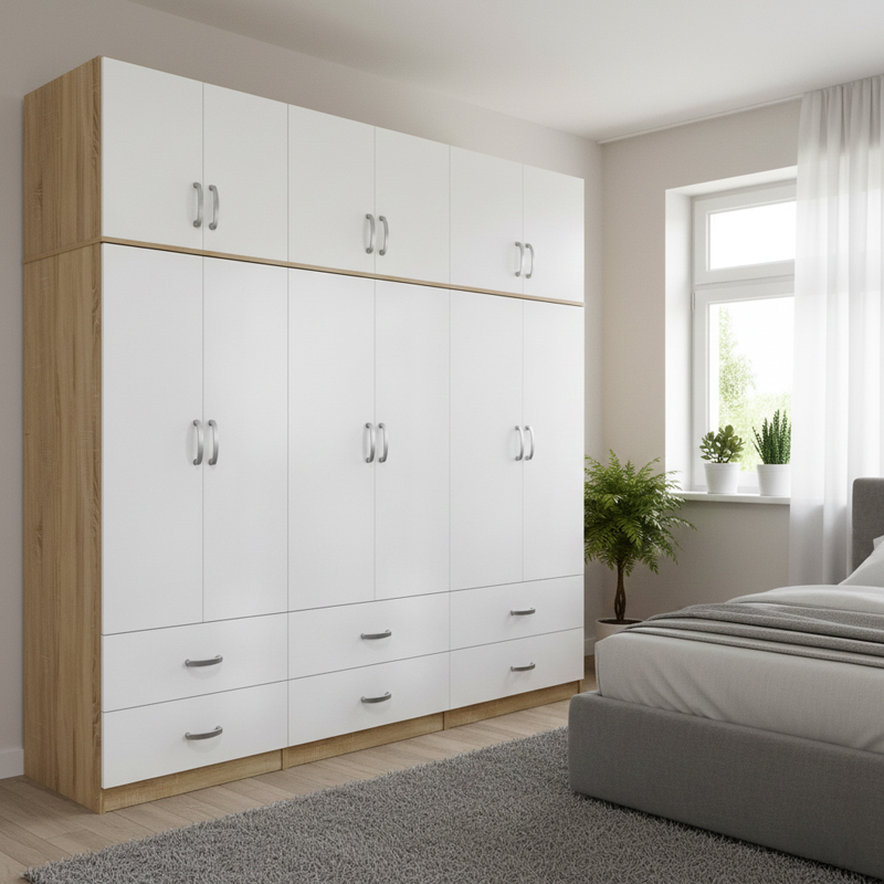 Ντουλάπα εξάφυλλη με συρτάρια και πατάρι Lego pakoworld sonoma-λευκή 240x42x240εκ