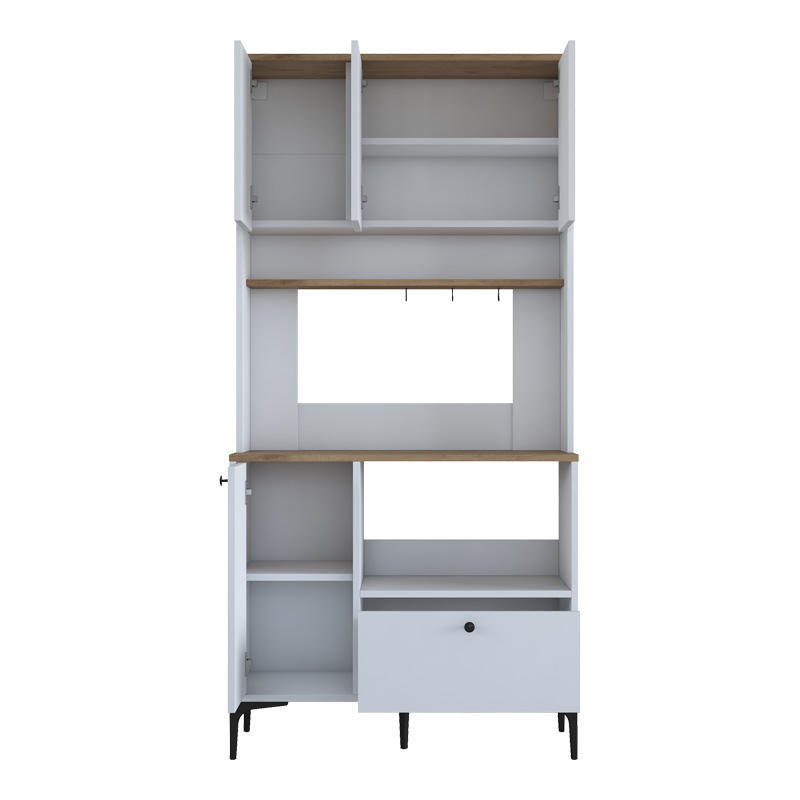 Διαθέτει τέσσερα ευρύχωρα ντουλάπια και ένα πρακτικό συρτάρι στο κάτω μέρος, ιδανικά για να αποθηκεύσετε τρόφιμα, σκεύη και μικρές ηλεκτρικές συσκευές. Επιπλέον, ο ανοιχτός χώρος με το ράφι είναι ιδανικός για να τοποθετήσετε τον φούρνο μικροκυμάτων σας και την καφετιέρα σας, δημιουργώντας έναν άνετο σταθμό καφέ και πρωινού.