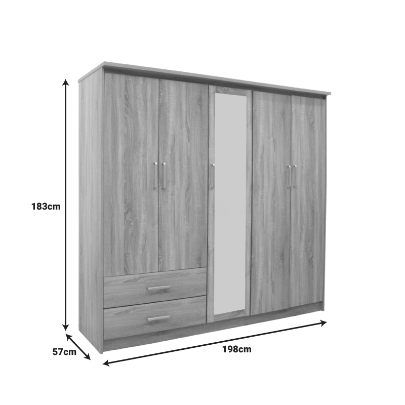 - Περιλαμβάνει δεξιά και αριστερά δύο διπλά φύλλα με εσωτερική ράγα για κρεμάστρες, το ένα κάτω έχει δύο μεγάλα συρόμενα συρτάρια, ενώ το άλλο φέρει εσωτερικό ράφι. Στο κέντρο της σύνθεσης υπάρχει στενή/μονή ντουλάπα με εξωτερικό καθρέφτη και εσωτερικά τρία ράφια. Οι ιδανικοί χώροι για την αποθήκευση ρούχων και αξεσουάρ.
