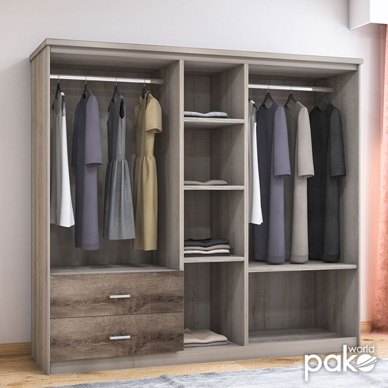 - Περιλαμβάνει δεξιά και αριστερά δύο διπλά φύλλα με εσωτερική ράγα για κρεμάστρες, το ένα κάτω έχει δύο μεγάλα συρόμενα συρτάρια, ενώ το άλλο φέρει εσωτερικό ράφι. Στο κέντρο της σύνθεσης υπάρχει στενή/μονή ντουλάπα με εξωτερικό καθρέφτη και εσωτερικά τρία ράφια. Οι ιδανικοί χώροι για την αποθήκευση ρούχων και αξεσουάρ.