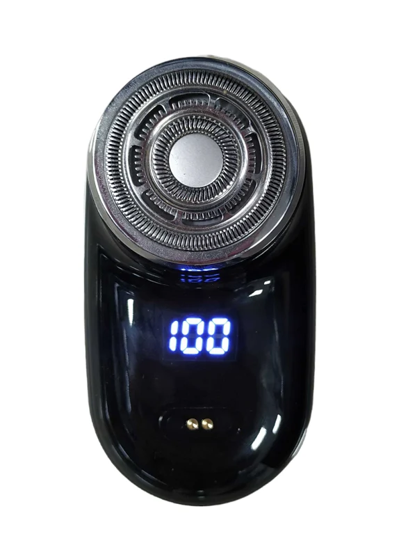Επαναφορτιζόμενη ξυριστική μηχανή με πρωτοποριακό σχεδιασμό, σε mini εργονομικό μέγεθος, με κυκλικές λεπίδες, ψηφιακή οθόνη ενδείξεων και μεταλλικό περίβλημα με ανάγλυφα σχέδια.