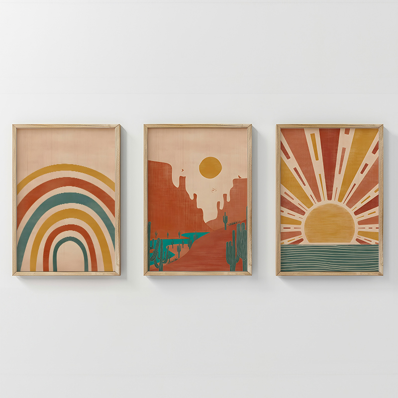 Εισάγετε στον χώρο σας ένα χαρούμενο, αισιόδοξο κλίμα με ρετρό αίσθηση, ιδανικό για να δώσει ζεστασιά και χρώμα. Το τρίπτυχο Jecko αποτελείται από τρία ξεχωριστά, δυναμικά τεμάχια, όλα βασισμένα σε μία γήινη, ρετρό χρωματική παλέτα. Αυτή η τριπλή διάταξη προσδίδει παιχνιδιάρικο ρυθμό, ζεστή ατμόσφαιρα και υψηλή αισθητική που ταιριάζει ιδανικά σε υπνοδωμάτια, παιδικά δωμάτια ή χώρους εργασίας.