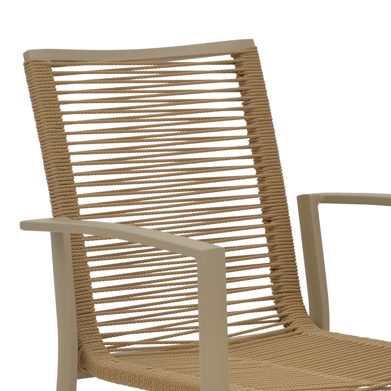 • Επένδυση καθίσματος με εξαιρετικής ποιότητας ύφασμα textilene σε φυσικό χρώμα. Το textilene είναι πλενόμενο και ανθεκτικό στις συνθήκες του εξωτερικού πέριβάλλοντος (ηλιακή ακτινοβολία, υγρασία).