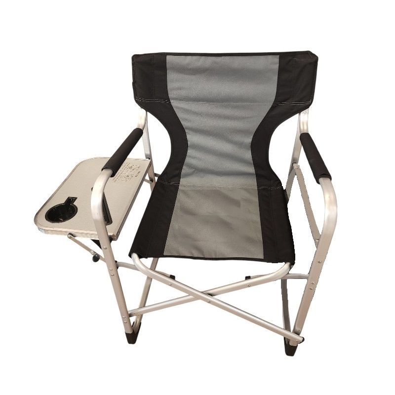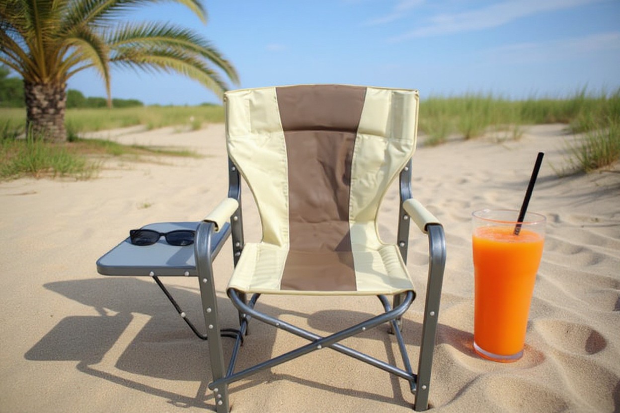Πτυσσόμενη καρέκλα παραλίας-camping με ενσωματωμένο πτυσσόμενο τραπεζάκι στη δεξιά πλευρά, με ποτηροθήκη.