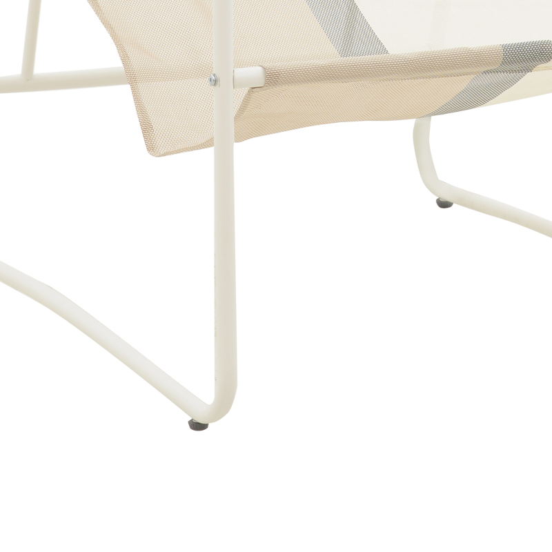 * Επένδυση υφάσματος textinene γκρι-εκρού χρώματος. Το textilene είναι ύφασμα μεγάλης αντοχής στην ηλιακή ακτινοβολία UV και την υγρασία, ενώ παράλληλα αφήνει το δέρμα να “αναπνέει” δημιουργώντας έτσι άνεση στην έδραση.