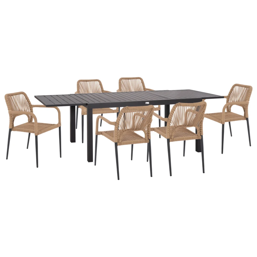 Αυτό το σετ τραπεζαρίας εξωτερικού χώρου αποτελείται από ένα ΣΚΟΥΡΟ ΓΚΡΙ επεκτεινόμενο τραπέζι αλουμινίου και 6 ΣΚΟΥΡΕΣ ΓΚΡΙ πολυθρόνες αλουμινίου με ΜΠΕΖ επένδυση από συνθετικό Twisted Rattan (σαν σχοινί).