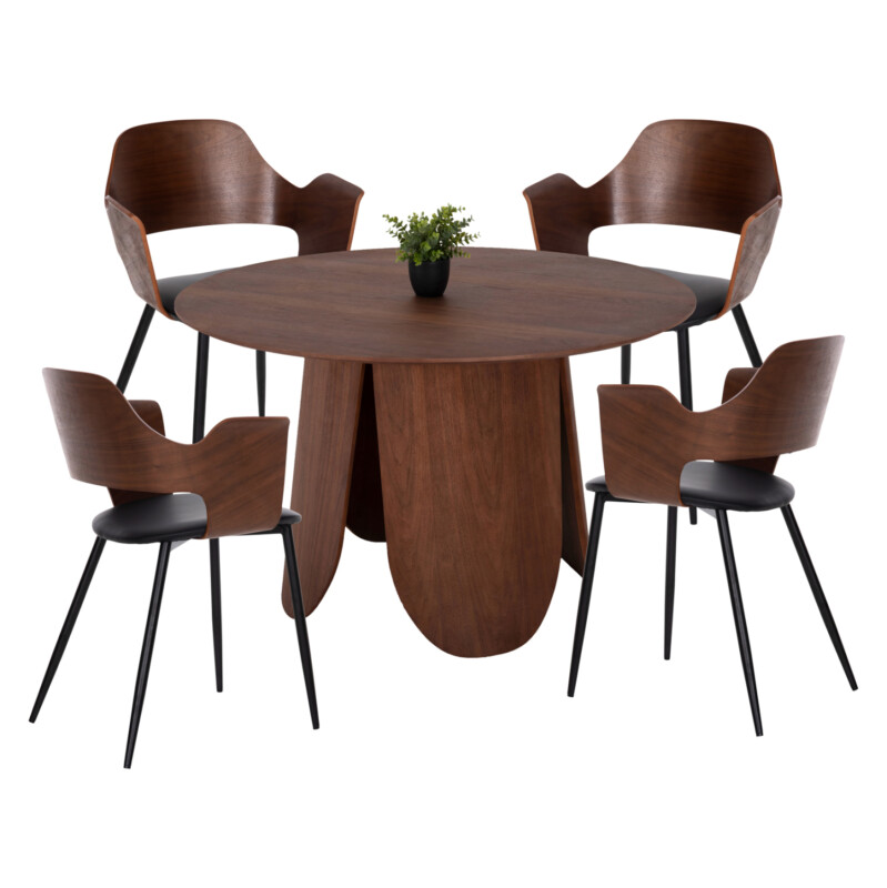 Αυτό το σετ τραπεζαρίας εσωτερικού χώρου αποτελείται από ένα τραπέζι DENTY και 4 καρέκλες VELP. Το DENTY είναι ένα στρογγυλό τραπέζι για την τραπεζαρία, με φαλτσοκομμένη επιφάνεια από MDF με καπλαμά δρυός σε ΚΑΡΥΔΙ χρώμα. Η επιφάνεια αυτή στηρίζεται σε μία πανέμορφη ξύλινη κυλινδρική βάση με ίδιο χρωματισμό. Οι καρέκλες VELP έχουν κάθισμα σε ΜΑΥΡΗ απόχρωση και ΜΑΥΡΑ μεταλλικά πόδια. Αυτό, όμως, που ξεχωρίζει είναι ότι ολόκληρη η πλάτη είναι ξύλινη σε ΚΑΡΥΔΙ χρώμα κι είναι κυρτή και αναπαυτική.