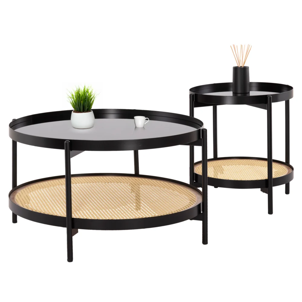 Το σετ 2 τραπεζιών SEITZ αποτελείται από 2 όμορφα στρογγυλά τραπέζια για το σαλόνι σε διαφορετικές διαστάσεις. Το χαρακτηριστικό τους είναι ότι διαθέτουν 2 επιφάνειες οι οποίες στηρίζονται σε ΜΑΥΡΕΣ μεταλλικές χιαστί βάσεις. Η επάνω επιφάνεια είναι γυάλινη (γυαλί ασφαλείας) σε ημιδιάφανη φιμέ υλοποίηση, ενώ η κάτω επιφάνεια είναι κατασκευασμένη από Rattan σε πλέξη wicker σε ΦΥΣΙΚΟ χρώμα. Ένα μοναδικό σετ που συνδυάζει πρακτικότητα και πολυτέλεια για τον χώρο σας.