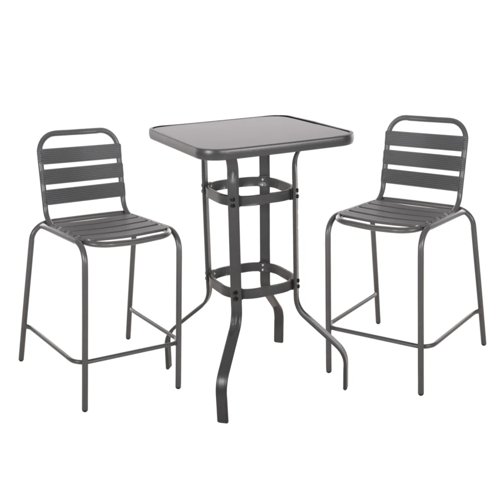 Σετ εξωτερικού χώρου που αποτελείται από 2 σκαμπό μπαρ μεσαίου ύψους και 1 τραπεζάκι μπαρ, όλα σε ΓΚΡΙ χρώμα. Τα σκαμπό διαθέτουν πλάτη και κάθισμα από «φέτες» αλουμινίου, ενώ ο σκελετός τόσο στα σκαμπό όσο και στο τραπέζι είναι μεταλλικός. Το γυαλί στο τραπέζι είναι ασφαλείας.