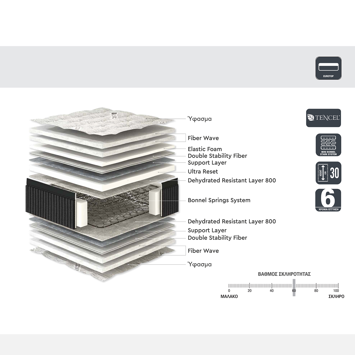 - Ύφασμα με ίνες Tencel από πρώτη ύλη οξιάς που αποτρέπει τη συγκέντρωση υγρασίας και βακτηρίων και είναι ανθεκτικό και απαλό (από τις δύο όψεις)