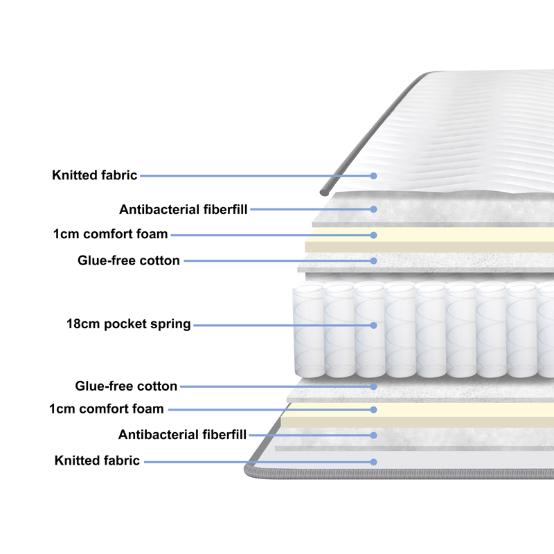 • Pocket Spring 18εκ: Πυρήνας στήριξης από ανεξάρτητα ελατήρια ύψους 18cm, κατασκευασμένα από ατσάλινο σύρμα 1.8mm. Διαθέτει επιπλέον ενίσχυση με δύο εξωτερικούς πυλώνες 2.2mm για αυξημένη σταθερότητα. Εξασφαλίζει ελάχιστη μεταφορά κίνησης ώστε να μην ενοχλείστε από τις κινήσεις του/της συντρόφου σας.