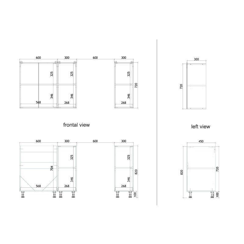 - Κάτω: Ένα διπλό ντουλάπι, ένα μονό και ένα ντουλάπι με συρτάρι