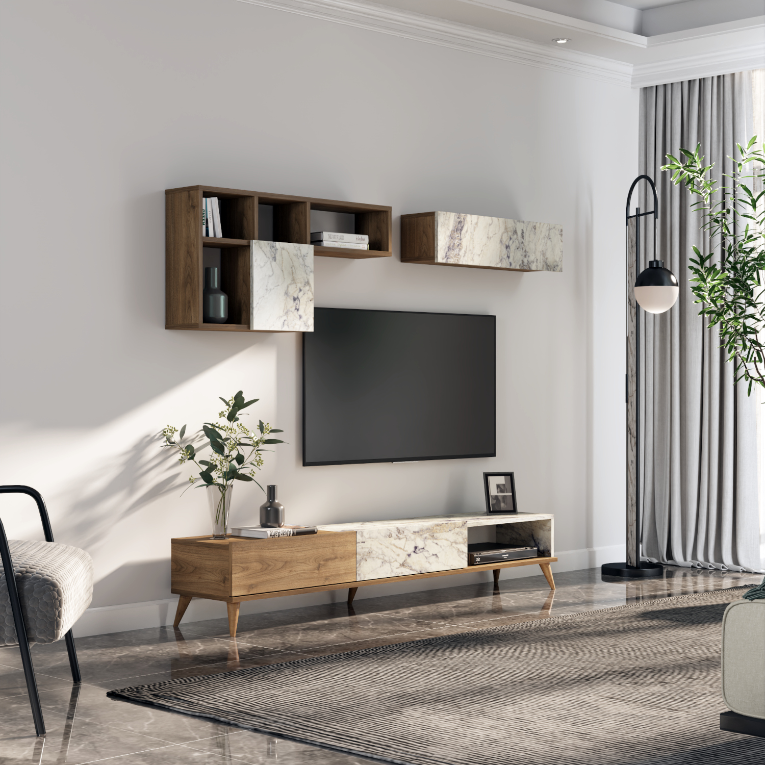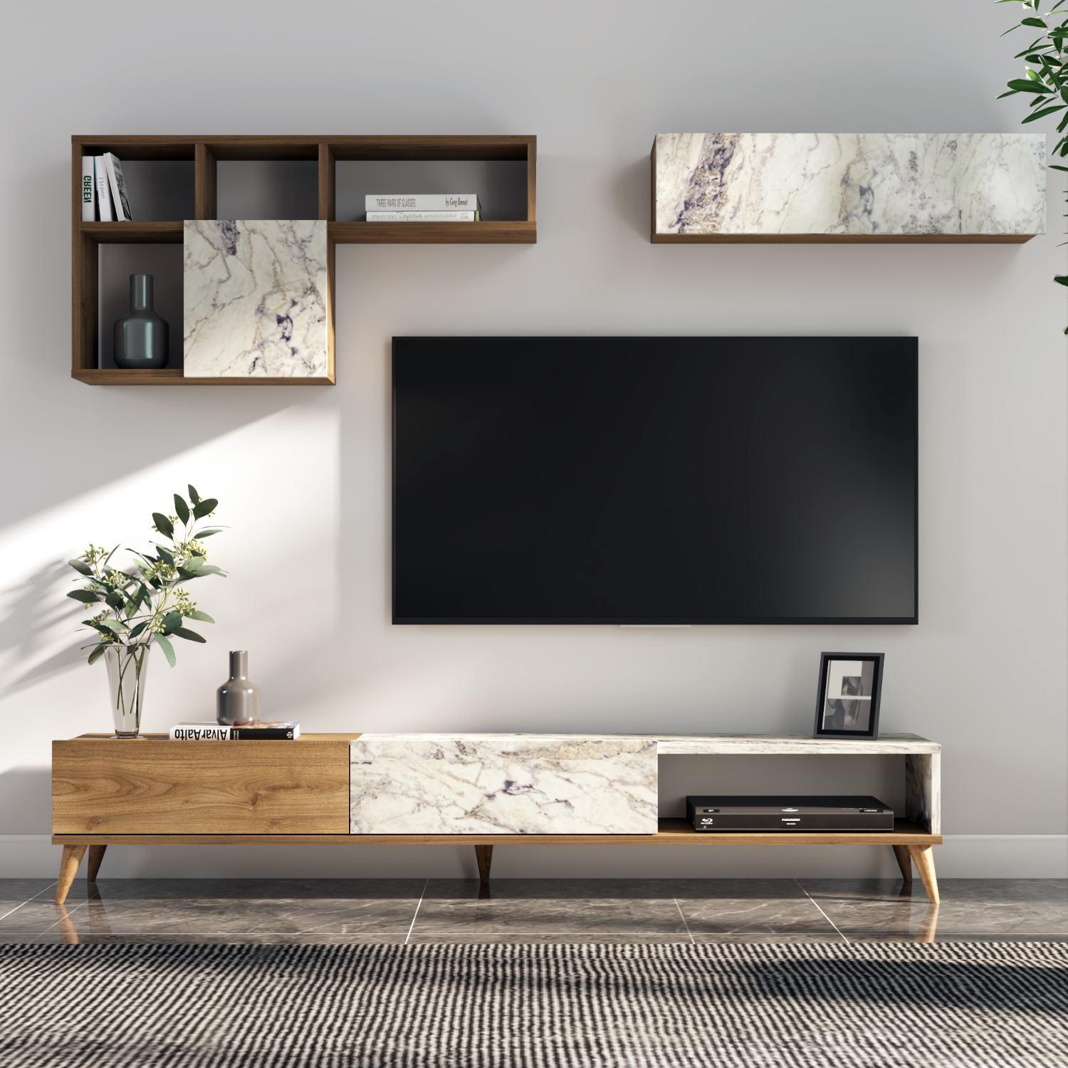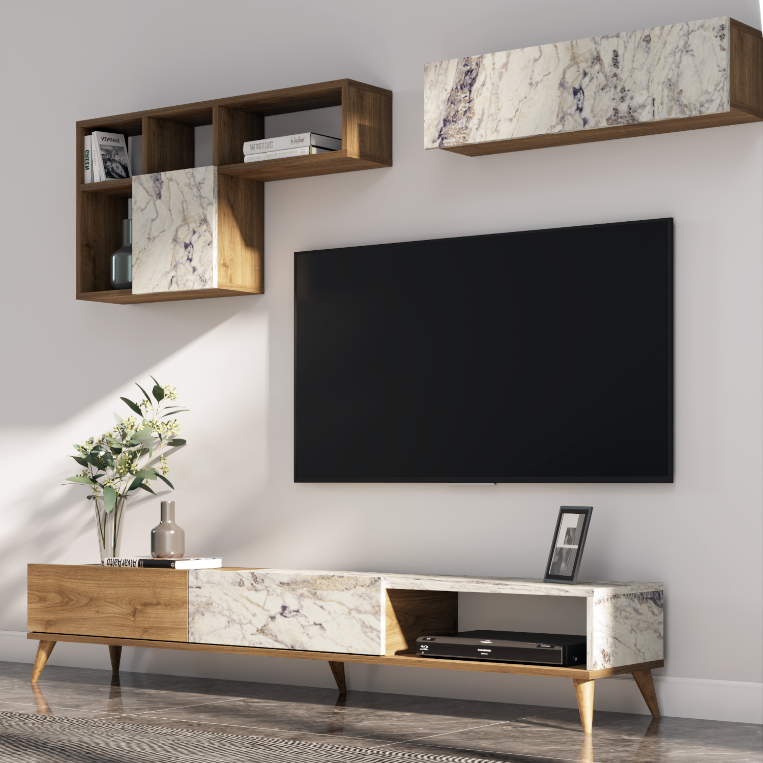 • Δύο επιτοίχια ράφια ολοκληρώνουν το σύνολο και παρέχουν επιπλέον χώρους αποθήκευσης για διακοσμητικά και άλλα αντικείμενα
