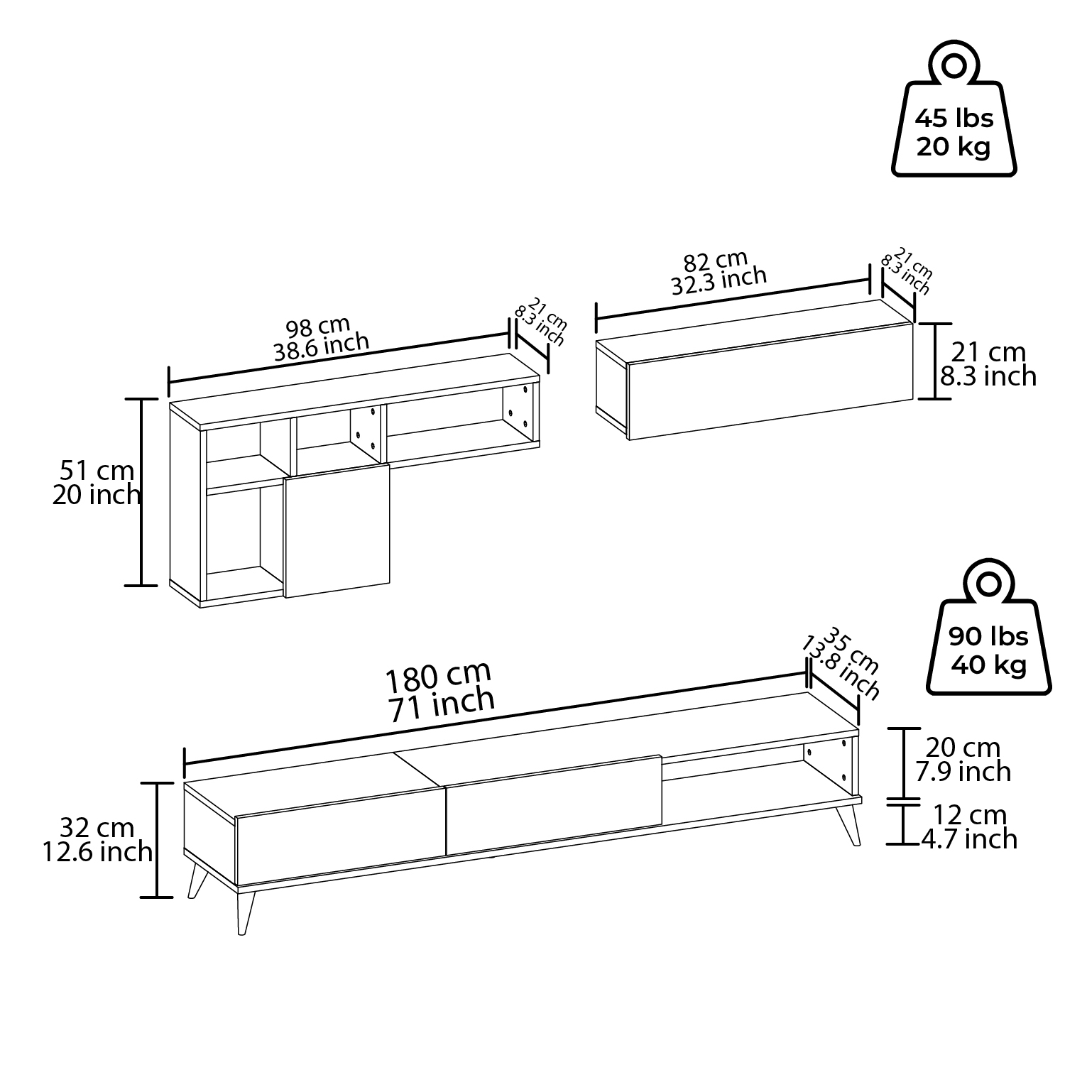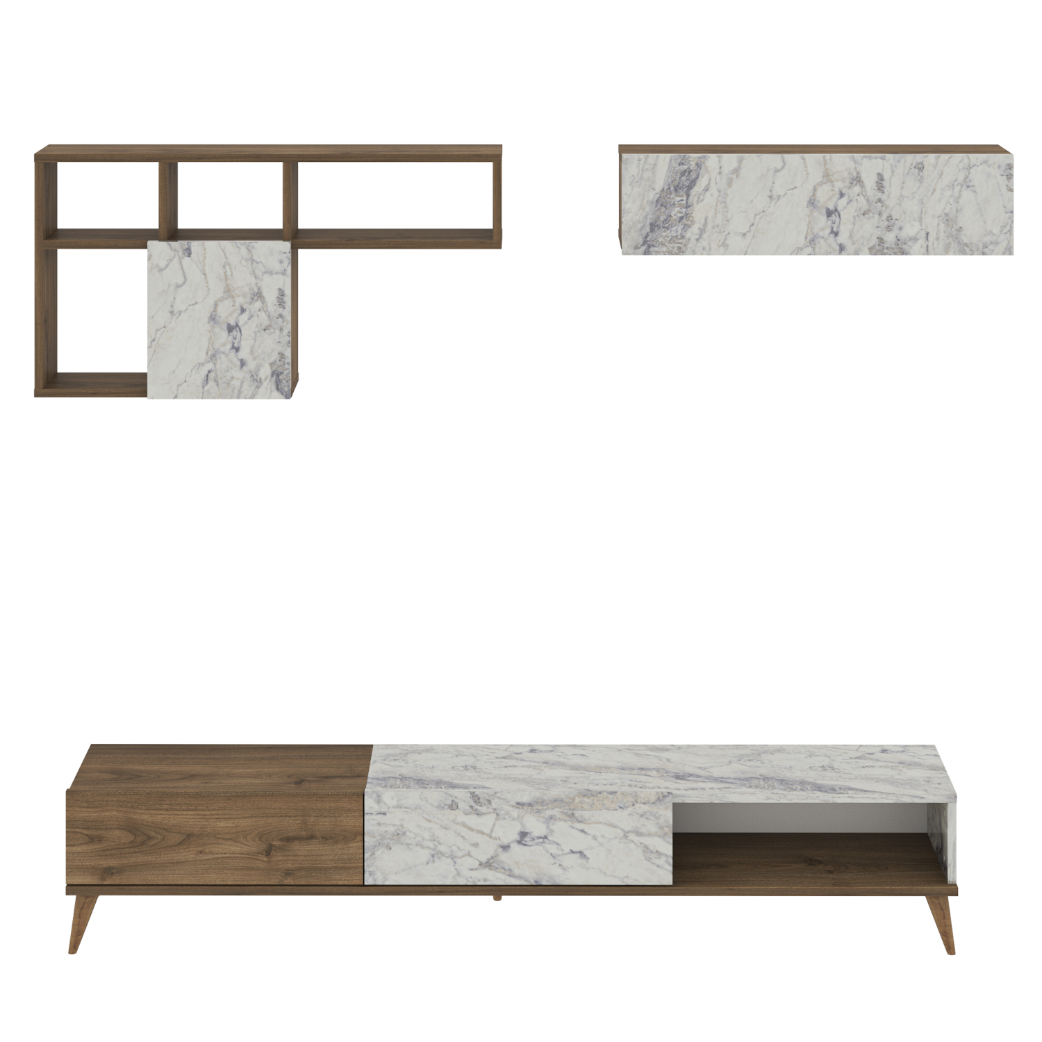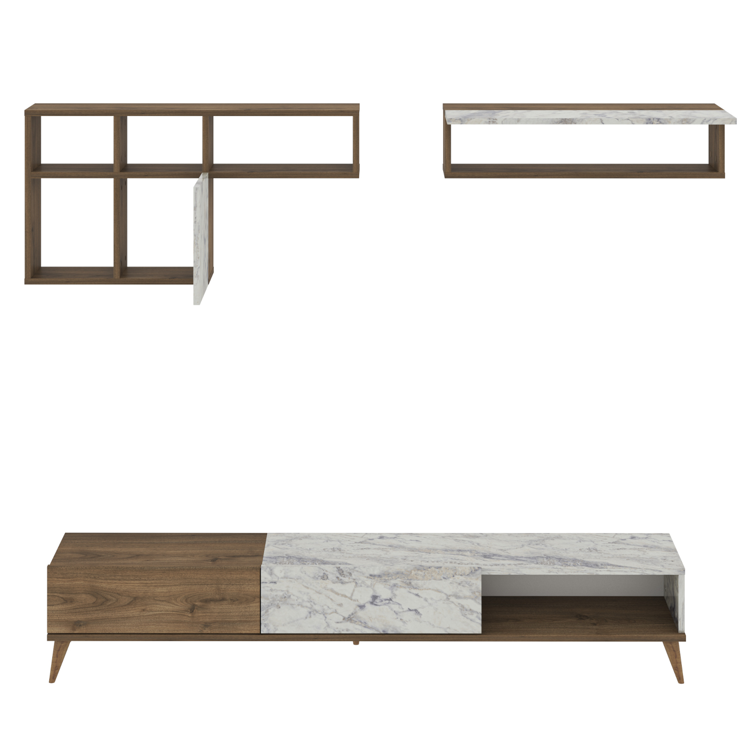 • Δύο επιτοίχια ράφια ολοκληρώνουν το σύνολο και παρέχουν επιπλέον χώρους αποθήκευσης για διακοσμητικά και άλλα αντικείμενα