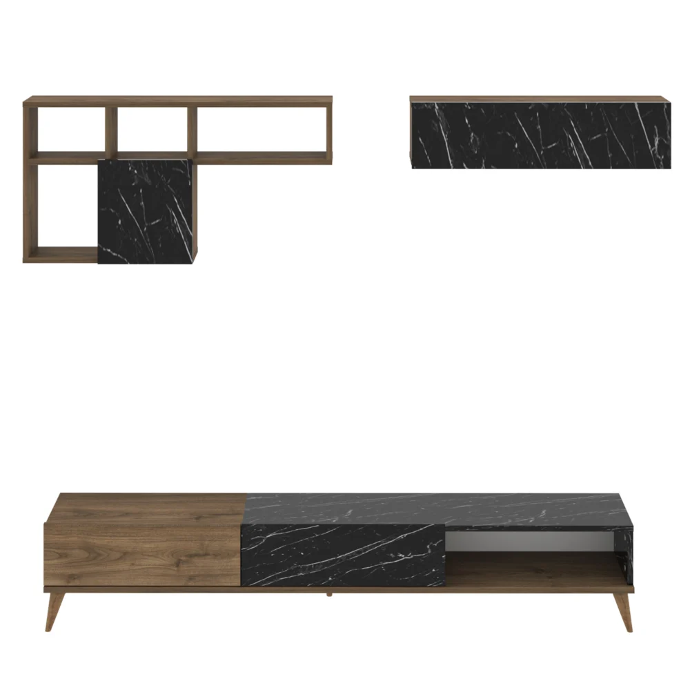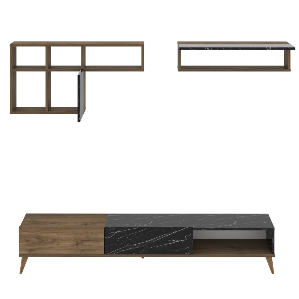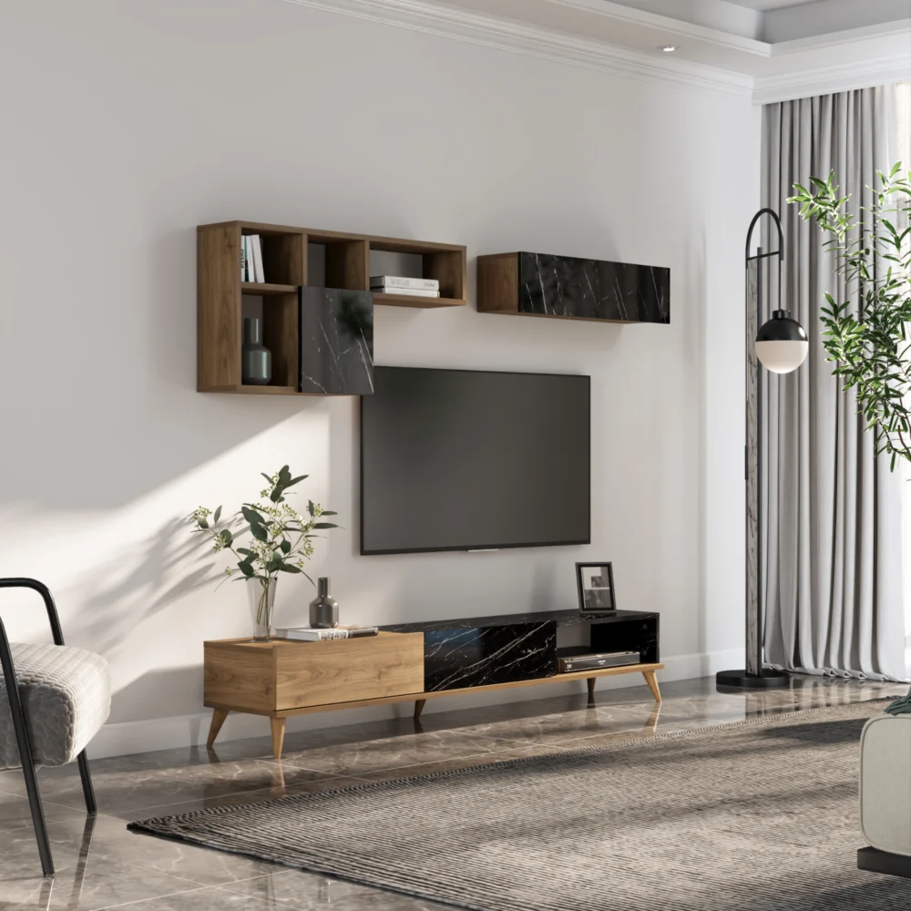 - Δύο επιτοίχια ράφια ολοκληρώνουν το σύνολο και παρέχουν επιπλέον χώρους αποθήκευσης για διακοσμητικά και άλλα αντικείμενα