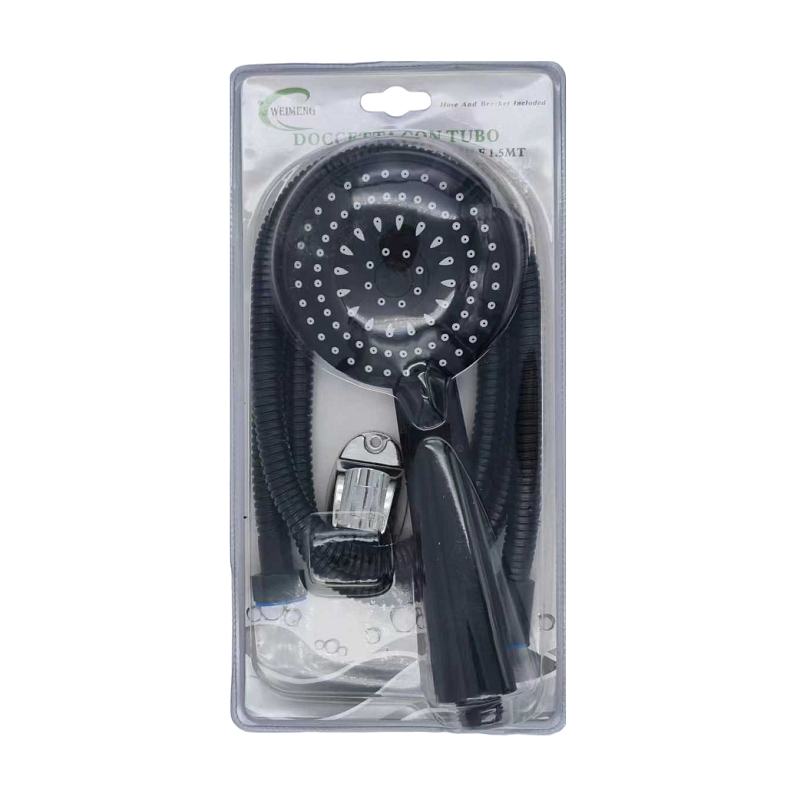 Τηλέφωνο-ακροφύσιο ντουζιέρας με 3 επιλογές πίεσης και σπιράλ σωλήνα μήκους 1.5 μέτρου, με όλα τα παρελκόμενα τοποθέτησης. Εύκολη τοποθέτηση σε όλες τις βρύσες μπανιέρας και ντουζιέρας. Το ακροφύσιο διαθέτει προστατευτικά σιλικόνης στις εξόδους νερού, που αποτρέπουν την συσσώρευση αλάτων. Υψηλή ποιότητα κατασκευής με υψηλής ανθεκτικότητα. Χρώμα: μαύρο.