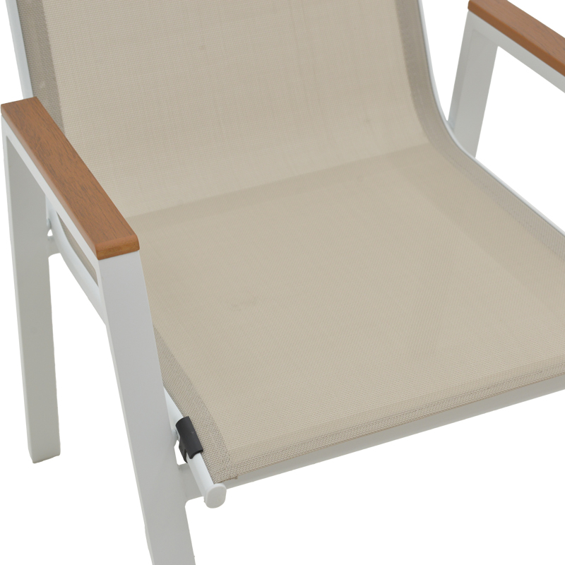 •  Σταθερός σκελετός από αλουμίνιο και ύφασμα textilene. Το textilene είναι ύφασμα μεγάλης αντοχής στην ηλιακή ακτινοβολία και την υγρασία ενώ παράλληλα αφήνει το δέρμα να “αναπνέει” δημιουργώντας έτσι άνεση στο κάθισμα. To αλουμίνιο παρέχει ανθεκτικότητα και ελαφριά κατασκευή, καθιστώντας την πολυθρόνα εύκολη στη μετακίνηση και την αποθήκευση. Eίναι επίσης ανθεκτικό στη διάβρωση και δεν συντηρεί σκουριά, καθιστώντας την κατάλληλη για χρήση σε εξωτερικούς χώρους.