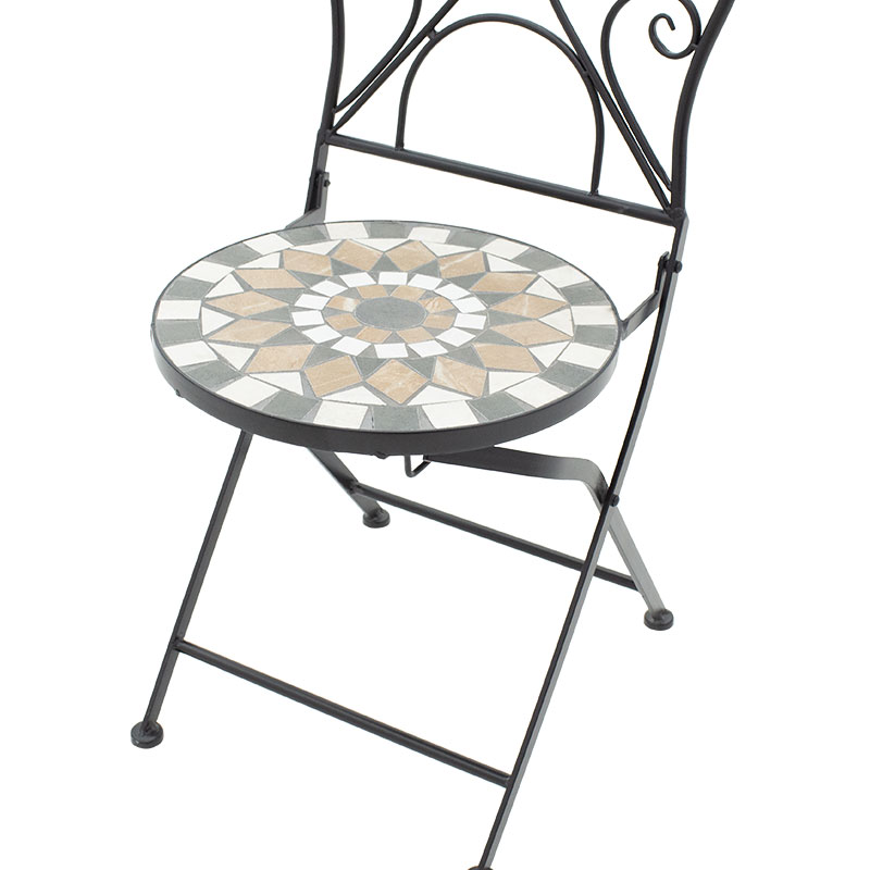 • Οι επιφάνειες του τραπεζιού και των καρεκλών φέρουν μωσαϊκό από φυσικό πλακάκι σε διάφορα χρώματα