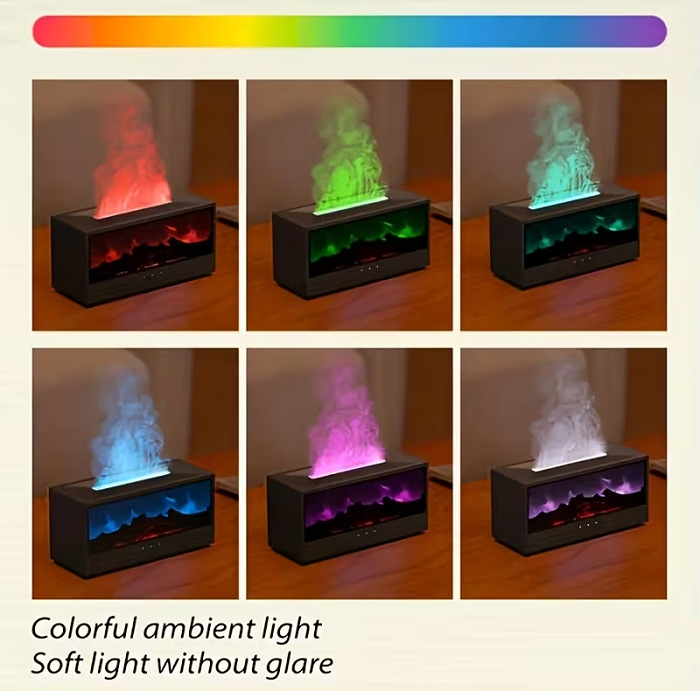 Υγραντήρας και διαχυτήρας αρώματος χώρου, με εντυπωσιακό εφέ τζακιού και φλόγας για μία υπέροχη ατμόσφαιρα στον χώρο σας. Απλά προσθέστε στο ειδικό δοχείο νερό και το αγαπημένο σας αιθέριο έλαιο, ρυθμίστε την ένταση και τα χρώματα που επιθυμείτε και απολαύστε το χαλαρωτικό, ατμοσφαιρικό εφέ της κινούμενης φλόγας!