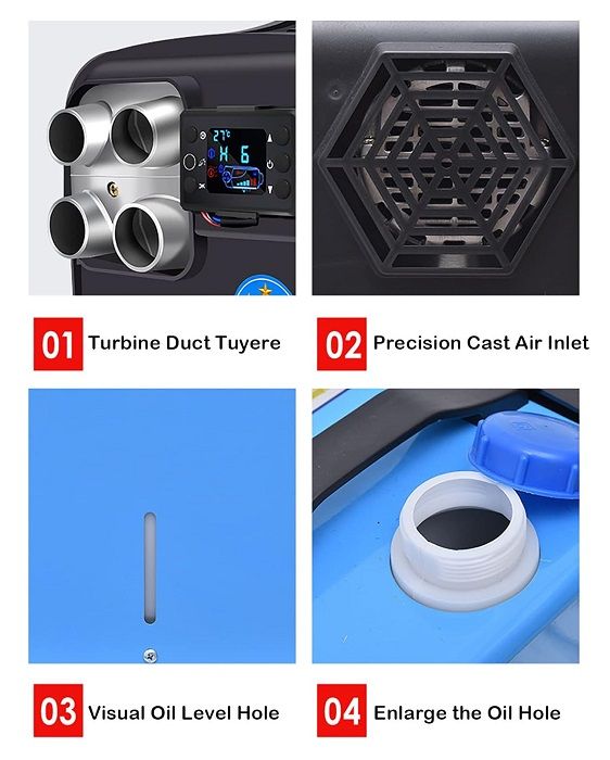 Πρακτικό φορητό αερόθερμο πετρελαίου, με οθόνη, ρυθμιζόμενη θερμοκρασία και εύκολη εγκατάσταση, ιδανικό για τροχόσπιτα, κάμπινγκ, μεγάλα οχήματα και για οποιοδήποτε μέρος χρειάζεστε θέρμανση χωρίς πρόσβαση σε ηλεκτρικό ρεύμα.