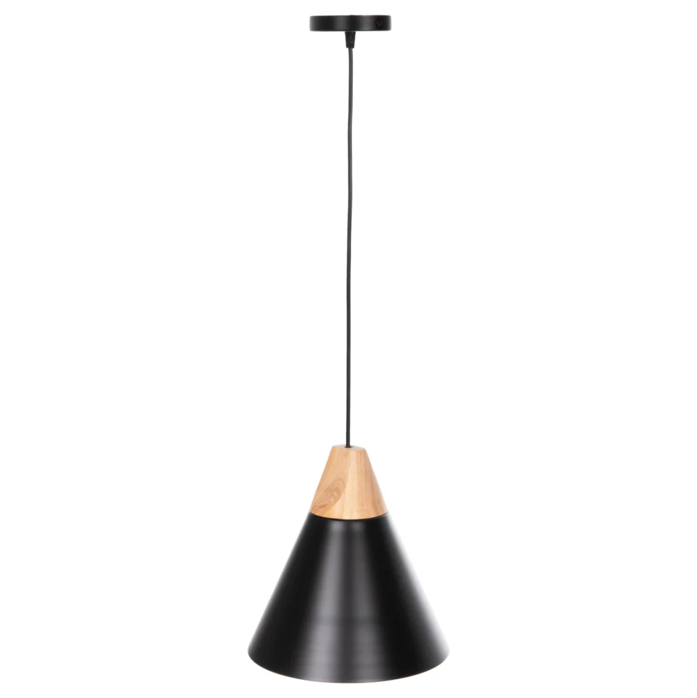 Ανακαλύψτε αυτό το νέο μας κρεμαστό φωτιστικό οροφής και ολοκληρώστε την διακόσμησή σας. Πρόκειται για ένα φωτιστικό με ΜΑΥΡΟ μεταλλικό καπέλο σε σχήμα κωνικής καμπάνας με λεπτομέρεια ξύλου στην κορυφή του φωτιστικού. Αισθητικά, ολοκληρώνεται με το επίσης ΜΑΥΡΟ καλώδιο κρέμασης και την μαύρη βάση οροφής, και αποτελεί την τελευταία τάση στα φωτιστικά οροφής.
