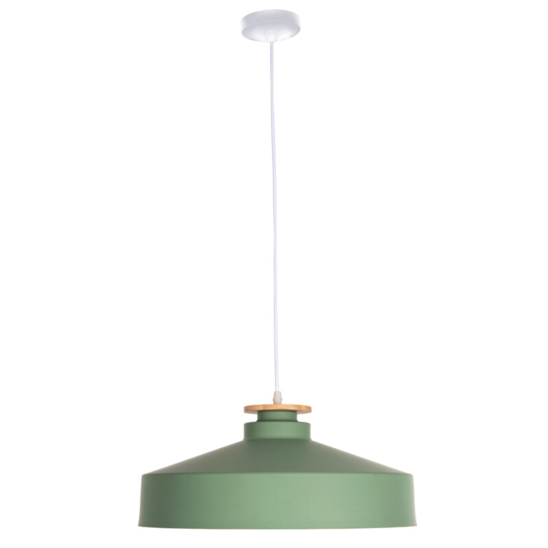 Ανακαλύψτε αυτό το νέο μας κρεμαστό φωτιστικό οροφής και ολοκληρώστε την διακόσμησή σας. Πρόκειται για ένα φωτιστικό με ΠΡΑΣΙΝΟ ρηχό μεταλλικό καπέλο σε σχήμα καμπάνας με λεπτομέρεια ξύλου στην κορυφή του φωτιστικού. Αισθητικά, ολοκληρώνεται με το λευκό καλώδιο κρέμασης και την λευκή βάση οροφής, και αποτελεί την τελευταία τάση στα φωτιστικά οροφής.