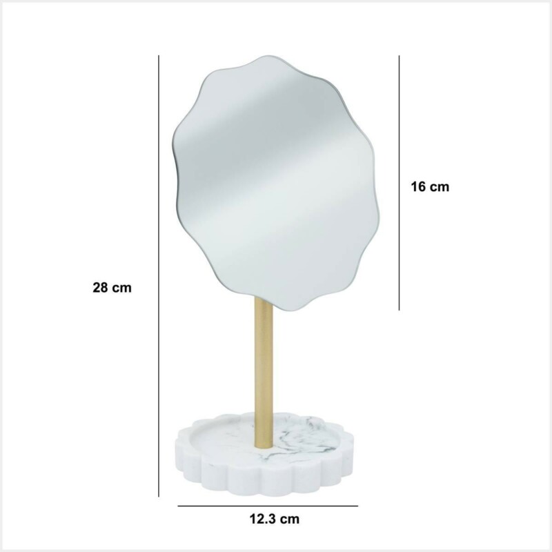 Ανακαλύψτε τον επιτραπέζιο καθρέφτη με τη μοντέρνα αισθητική που θα ανανεώσει το χώρο σας. Κατασκευασμένος από ανθεκτικό polyresin υλικό σε κομψό λευκό χρώμα με μαρμάρινο εφέ και κομψή χρυσή βάση, αποτελεί το απόλυτο σημείο στυλ. Ο καθρέφτης έχει μοναδικό σχήμα λουλουδιού και χάρη στον περιστρεφόμενο σχεδιασμό του, είναι ιδανικός για το λεπτομερές μακιγιάζ σας. Επιπλέον, η πρακτική του βάση διαθέτει ραφάκι για να οργανώνετε άψογα τα κοκαλάκια και τα κοσμήματα σας. Συνδυάστε τον με τα υπόλοιπα προϊόντα του ίδιου σετ και δημιουργήστε μια εντυπωσιακή αρμονία στον χώρο σας.