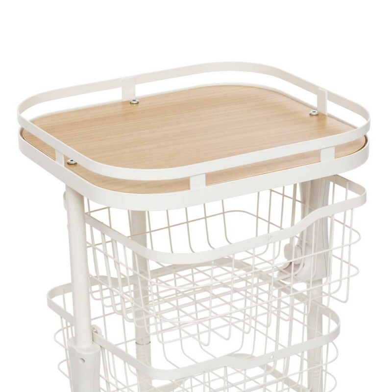 Τα φρούτα, τα λαχανικά, τα προϊόντα καθαρισμού, τα αξεσουάρ μπάνιου ή τα γραφειακά εφόδια βρίσκουν εύκολα τη θέση τους. Το άνω μέρος από MDF με διακόσμηση ανοιχτό ξύλο προσθέτει μια ζεστή πινελιά και επιτρέπει την τοποθέτηση μικρών ηλεκτρικών συσκευών, φυτών ή διακοσμητικών αντικειμένων.
