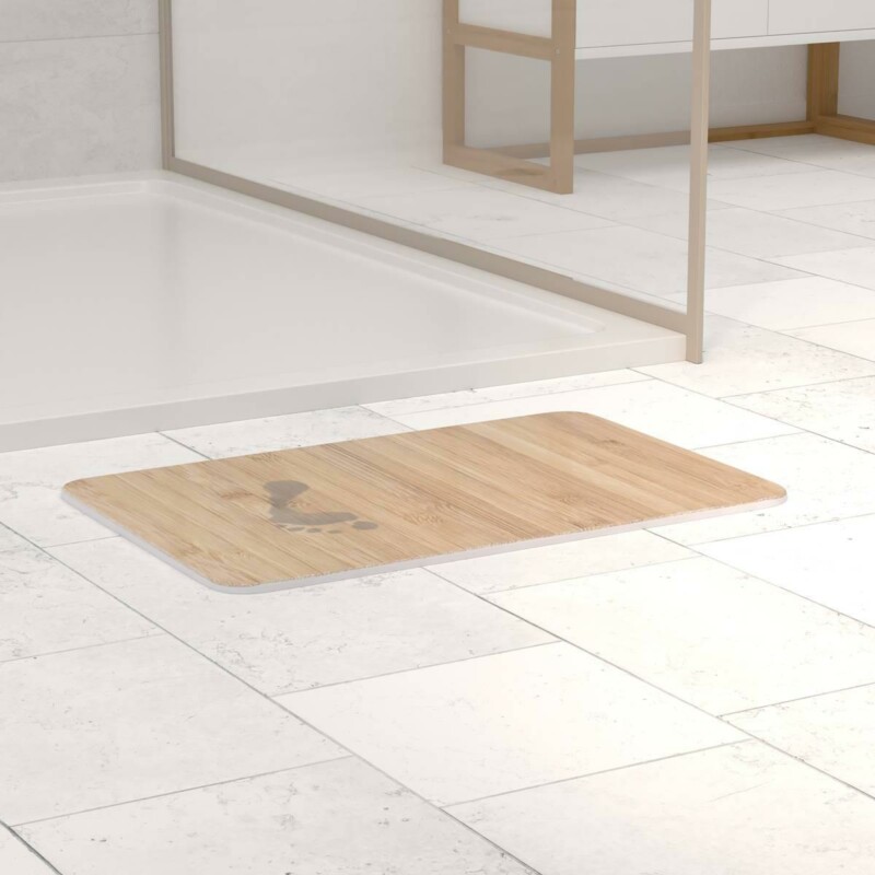 Ανακαλύψτε το απόλυτο πατάκι μπάνιου με εφέ ξύλου! Νέα γενιά πατάκι μπάνιου από φυσικό ορυκτό διατομίτη, σχεδιασμένο για να απορροφά εύκολα το νερό και να στεγνώνει σε χρόνο ρεκόρ. Προστατεύστε το σπίτι σας από την ανάπτυξη μούχλας και βακτηρίων χάρη στις αντιβακτηριδιακές του ιδιότητες. Με αντιολισθητική, σαγρέ επιφάνεια, για απόλυτη ασφάλεια και άνεση. ΣΗΜΕΙΩΣΗ: Λόγω του άκαμπτου υλικού, δεν μπορεί να τυλιχτεί σε ρολό.