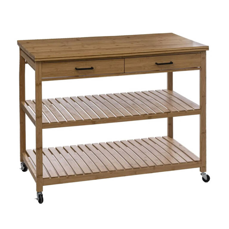 Το τρόλεϊ κουζίνας, από την εταιρία 5Five Simply Smart, είναι κατασκευασμένο από ξύλο μπαμπού. Διαθέτει 3 ράφια, 2 συρτάρια και 4 περιστρεφόμενους τροχούς με φρένα για γρήγορη και εύκολη κίνηση.
