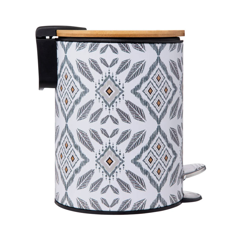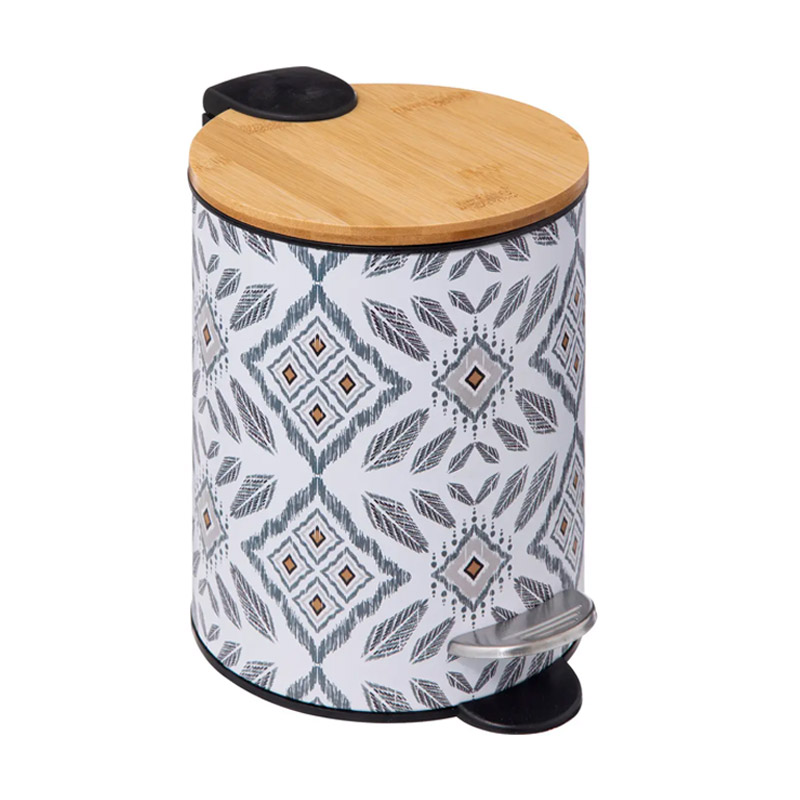 Ο κάδος απορριμμάτων χαρτοδοχείο από την εταιρεία 5Five Simply Smart, είναι κατασκευασμένος από ανθεκτικό μέταλλο και μπαμπού. Χάρη στο αυτόματο άνοιγμα του πεντάλ, μπορείτε να πετάξετε τα απορρίμματά σας, ακόμη και με τα δύο χέρια απασχολημένα και πάνω απ’ όλα, χωρίς να χρειάζεται να αγγίξετε τον κάδο. Ο εσωτερικός πλαστικός κάδος είναι αφαιρούμενος και το καπάκι ανοίγει με ελαφρά πίεση στο πεντάλ και κλείνει αθόρυβα.