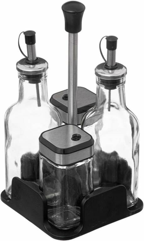 Ανθεκτικά Υλικά: Τα δοχεία είναι κατασκευασμένα από γυαλί, το οποίο εγγυάται μακροχρόνια αντοχή και ευκολία στον καθαρισμό. Η βάση, από συνδυασμό πλαστικού και ανοξείδωτου χάλυβα, είναι σταθερή και κομψή, προσδίδοντας επιπλέον ελκυστικότητα στο προϊόν.