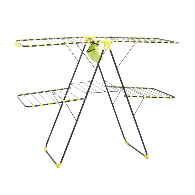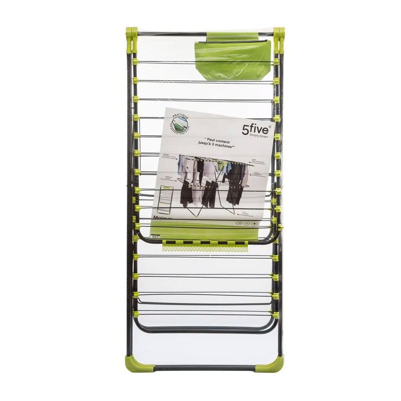 Η απλώστρα, από την εταιρία 5Five Simply Smart, είναι κατασκευασμένη από ατσάλι και έχει χώρο στεγνώματος 31 m. Είναι εξοπλισμένη με 2 πτυσσόμενα ράφια στο πάνω μέρος, 2 μικρότερα στο κάτω μέρος και 1 ράφι στη μέση. Επιπρόσθετα, περιλαμβάνει τσάντα για τα μανταλάκια.