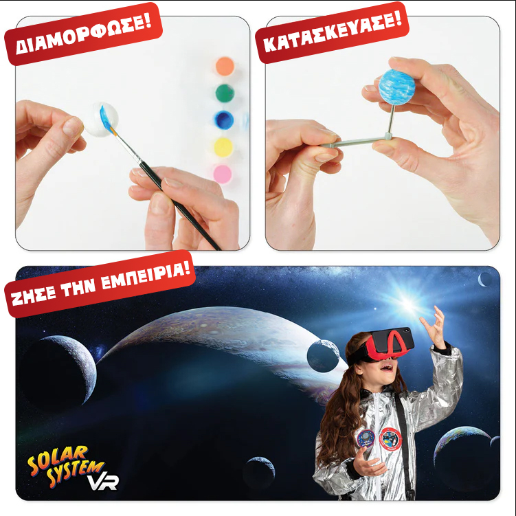 Εξερευνήστε το ηλιακό μας σύστημα σε εκπληκτική εικονική πραγματικότητα! Το σετ Solar System VR περιλαμβάνει υλικά για την κατασκευή του δικού σας πλανηταρίου (βάση πλανητών, πλανήτες και χρώματα)