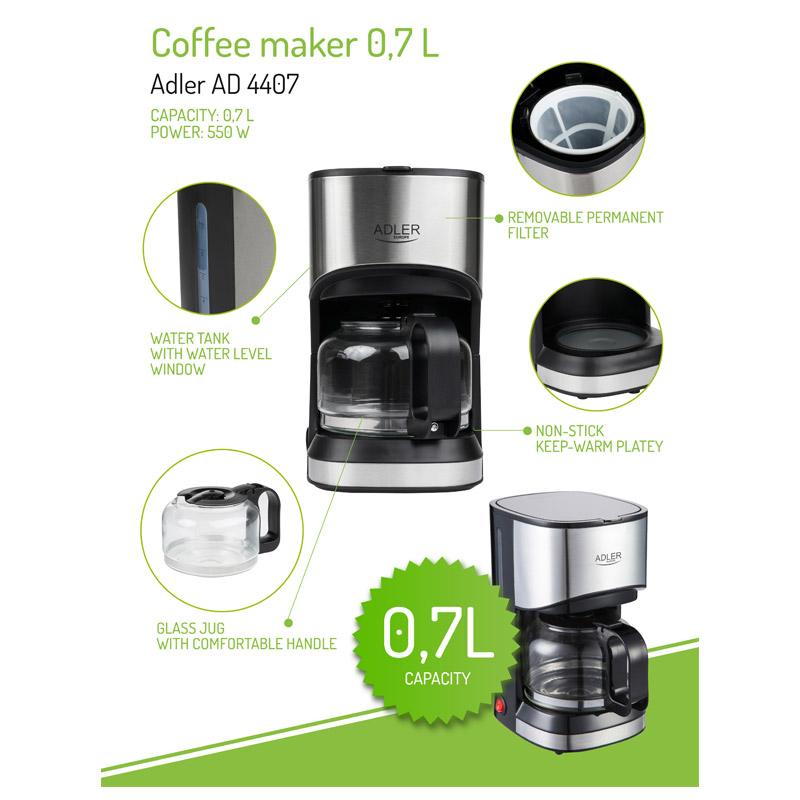 Η καφετιέρα φίλτρου, από την Adler, έχει χωρητικότητα 0.7 Lt, ισχύ 550 W και αφαιρούμενη υποδοχή φίλτρου, η οποία καθαρίζεται γρήγορα και εύκολα.